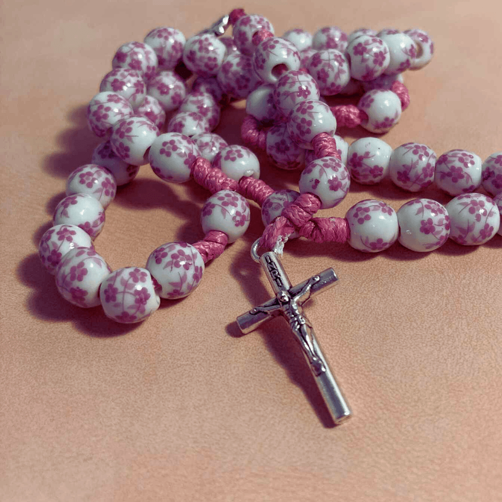 Różaniec z porcelany biały z purowo różowym motywem